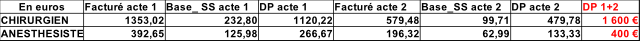 La colonne «Facturé acte 1 » contient le montant facturé pour l’acte 1 (1353.02 pour la chirurgie et 392.65 pour l’anesthésie).