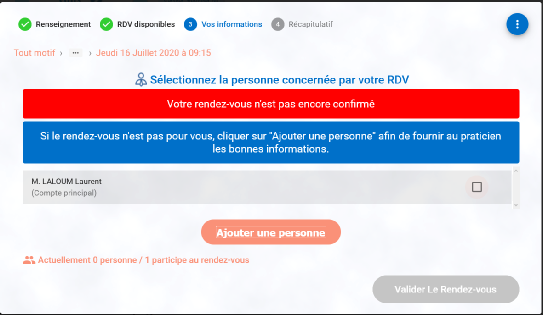 2)Si le rendez-vous est pour une autre personne (votre enfant, par exemple), cliquez sur « Ajouter une personne », et ajoutez cette personne. Ensuite ne cochez pas cette case, mais uniquement celle en regard de la personne pour laquelle est le rendez-vous. L’accompagnant n’a pas à être inscrit (=la case en regard du nom de l’accompagnant ne doit pas être cochée) sauf s’il a besoin d’être examiné lui aussi. Il n’est pas considéré comme participant au rendez-vous.